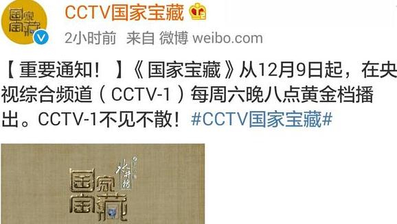 高娛傳媒明星經(jīng)紀(jì)公司消息 12月8日《國(guó)家寶藏》節(jié)目組官方微博發(fā)布消息:節(jié)目從12月9日起,在央視綜合頻道(CCTV-1)每周六晚八點(diǎn)黃金檔播出。CCTV-1不見不散!