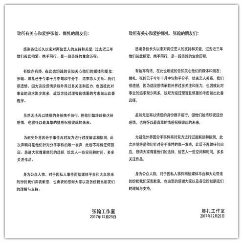 張翰娜扎分手太有儀式感!明星經(jīng)紀(jì)公司:圣誕節(jié)同發(fā)聲明連內(nèi)容都一樣