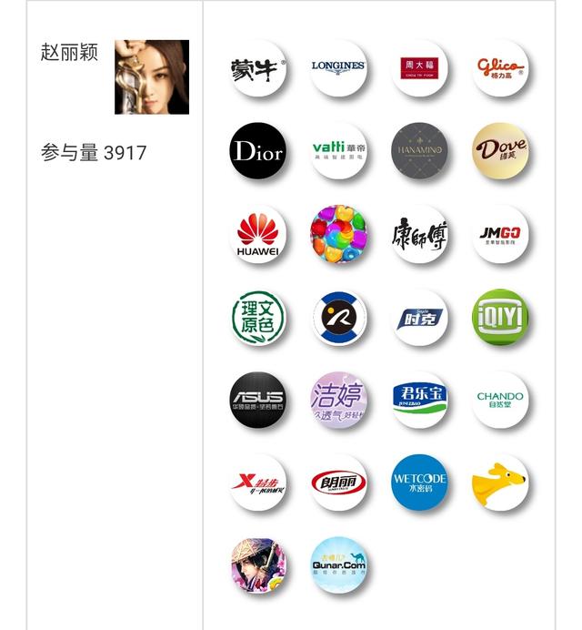 趙麗穎位居榜單第一位,手上代言品牌數(shù)量高達(dá)26個(gè),其中包括蒙牛,浪琴,周大福,迪奧,德芙以及華為等眾多國(guó)際知名品牌,可謂如日中天,霸氣登頂!